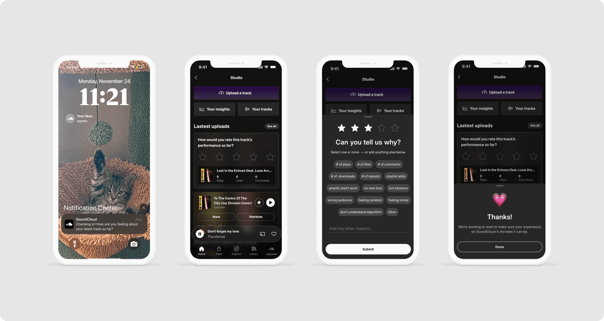 The Artist Satisfaction Survey is an in-app survey triggered seven days after an artist uploads a track, asking them how they feel about its performance. The responses help us track feature satisfaction over time as a company KPI and allow us to recommend actions artists can take to improve engagement on the platform.
